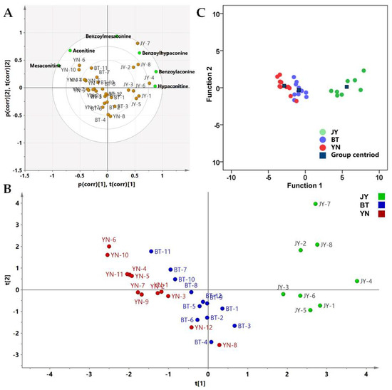 (A) Biplot of the PCA; (B) 2-D loadings plot and scores of the PCA; (C) Scores plot of the canonical discriminant functions of the 32 samples. JY is the Fuzi from Jiangyou; BT is the Fuzi from Butuo; and YN is the Fuzi from Yunnan.