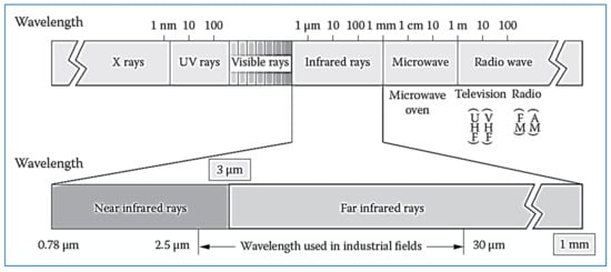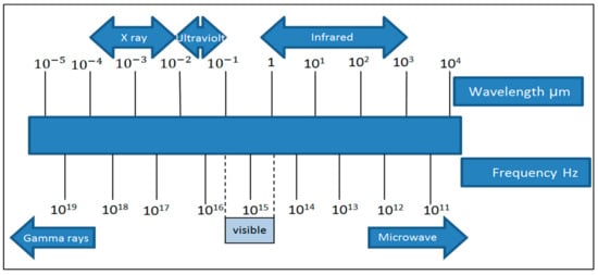 Infrared radiation is part of the electromagnetic spectrum that is located between the visible region and microwaves. Its wavelength ranges from 0.5 to 100 µm. In 1800, Herschel wrote the first scientific report on infrared heating. In his report, it was shown that when the lenses were exposed to the sun, the paper beneath was burned. In the study, a prism was used to separate the light into different colors and a thermometer was subsequently placed in the different colors of the solar energy spectrum. Researchers noticed that there was severe heating in the area beyond the red color, which began at the end of the visible spectrum. The invisible part of the spectrum is called infrared and it is in the wavelength range of 0.76–350 µm [3]. The heat from the sun’s rays is infrared and is part of the electromagnetic radiation [6]. Sixty-six percent of solar radiation is infrared. Figure 1 and Figure 2 illustrate the electromagnetic spectrum of different types of radiation, including infrared.