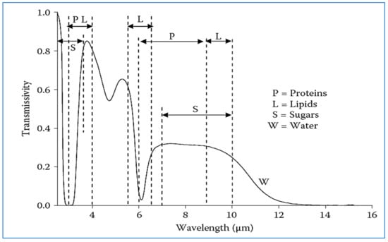 Table 1 shows that there is a strong absorption due to longitudinal vibrations. The absorption of the material to the radiation does not make it saturated with infrared radiation because the molecules excited by the vibratory movement continuously lose energy in random directions as a result of collisions between the molecules, which transfer energy to the surrounding environment in the form of heat. Wavelengths ranging within 1.4–5 µm are considered more effective in cooking food because of their ability to penetrate the steam layer surrounding the food as well as within the food a few millimeters deep. Most infrared radiation is absorbed by a thin layer of organic matter and water, so heating is superficial. The process of infrared heating is faster because the energy is transferred from the heating source to the food simultaneously. Therefore, there is no need for another method to transfer energy, for example, the use of hot air. The heat from infrared heating is produced on the surface of the infrared treated material, so the inside of the material is heated by the connection between the food molecules, thus the temperature is graded from the surface to the center. The air in contact with the surface of the food is heated indirectly, but it is not as hot as it occurs in heating by convection and conduction. The infrared absorption ranges by food components are shown in Figure 4, which shows that the food components interfere with each other in the absorption of different infrared spectra. Water mainly affects the absorption of incident radiation at all wavelengths, while the absorption of proteins by infrared radiation is at wavelengths 3–4 and 6–9 µm. Fat absorption is at wavelengths 3–4, 6 and 9–10 µm, and sugars are 3 and 7–10 µm. The water absorption beams are 3, 4.7, 6, and 15.3 µm [13]. In addition, when the thickness of the food increases, the absorption increases.