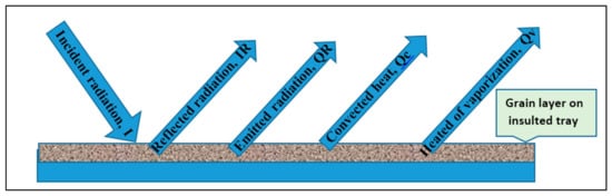 The energy that dehydrates food is radiant energy. The infrared source used in food drying is infrared lamps and ceramic heaters by electricity or gas. Infrared rays do not need a medium to transmit radiation energy from the source to the surface of the food. This is an excellent feature, as the food is considered to absorb the infrared radiation and dry itself directly. Therefore, in order to improve the drying efficiency, the absorption and dispersion of the incident radiation should be lower and food should contain water. The infrared source must be in a closed room and its surface should be highly reflective for the purpose of maximizing the multiple reflections to increase energy efficiency [9]. Infrared absorption in food is differentiated regarding protein, fat, carbohydrates, and water. The direction of incident radiation, the properties of the food surface, and the spectral structure also determine the absorption of infrared radiation. One of the determinants of the use of infrared radiation in food is the heterogeneity of its shape and size, so the intensity of radiation falling on the material is different from one place to another. Figure 5 shows the transformation of fell IR on rice grains into different components [38]. The walls and bottom of the plate should be coated with aluminum foil in order to reduce heat loss and to reflect the falling rays on them and be radioactive walls. The increase of reflected and emitted radiation, heat transfer by convection and heat of evaporation is different depending on the surface characteristics and the water condition in the rice [36,38].