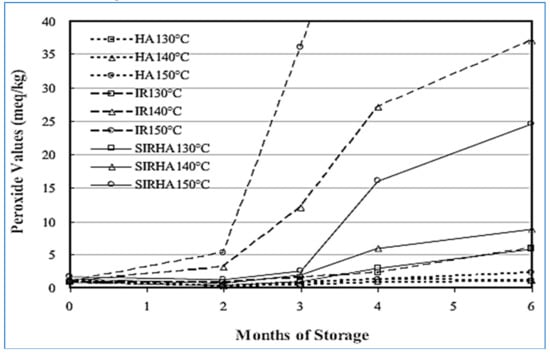 The value of peroxide increases rapidly when only infrared and infrared with hot air are treated together as a result of higher temperatures. The value of peroxide after three months was 1.59, 12.10, and 36.07 meq/kg at temperatures of 130, 140, and 150 °C, respectively (Figure 7). Infrared roasting at 150 °C gives a significant increase in peroxide value and higher oxidation rates than other treatments. The reason for this was that the infrared rays penetrate the almonds quickly and cause the fat to move to the surface exposed to high temperature, thus causing rapid oxidation. The best conditions for roasting almonds and ensuring that the peroxide number of almonds within the permissible limits of 5 meq/kg are the use of infrared and hot air together and hot air only at temperatures of 130–150 °C, and the use of infrared radiation at 130 °C prolong the duration storage from four to five months at 37 °C, while hot-air roasting prolongs the storage period even longer [54]. Infrared roasting of cashew nuts improves the oxidative stability of its oil [55]. This may be the result of the formation of the products of Millard reactions that have antioxidant effects.