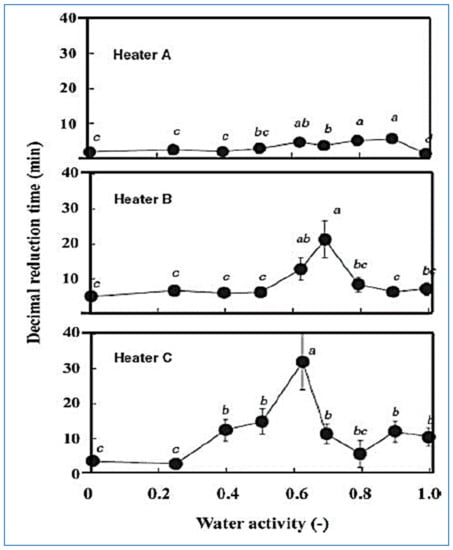 Relationship between water activity and decimal reduction times for B. subtilis spores using infrared treatment [28].