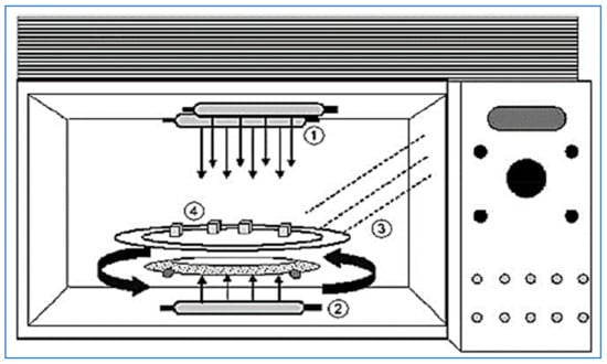 Heist and Cremer [73] studied the effect of infrared bread on the sensory qualities and energy use of cakes made from white and bleached and non-white flour and compared it to a traditional oven. Lee [74] merged between the microwave oven and the halogen lamp. Ninety percent of radiation energy within wavelength was less than 1 mµ and used as an infrared source. Two of them were used above and two at the bottom so that there was no interference between them in the microwave and this method gives more homogeneity in cooking. In this design, there were two mechanisms: Microwave heats food quickly, and infrared activates the reactions of tanning and crisping, and this method eliminates the problem of poor quality of baking using microwave [75]. The microwave has halogen lamps that emit infrared rays, which are divided into two parts, one part placed up and another down and there is a rotating base for the purpose of homogenization. The halogen lamps are 15 cm away from the material to be baked while the other halogen lamps are placed under the rotating plate (Figure 10). The results of the experiment are that the cake size increased with increasing baking time and the color and hardness of the cake were similar to the conventional oven [76].