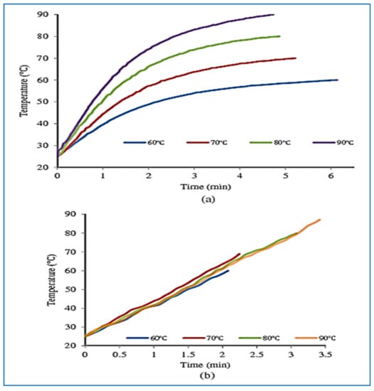 Juice temperatures change over time (a) conventional heating, (b) infrared heating [18].