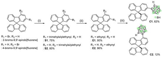 In this context, we selected 9,9′-spirobifluorene as the donor for attachment to the o-carborane in order to investigate the relationship between geometry and optoelectronic behavior in more detail. 9,9′-Spirobifluorene derivatives have been extensively used as prominent versatile materials [63] in a variety of optoelectronic applications, such as organic light-emitting diodes (OLEDs) [64,65,66,67,68,69] and photovoltaic cells [70,71,72]. Herein, we report two spirobifluorene-based o-carboranyl compounds as novel donor‒acceptor systems (Figure 1, C1 and C2). The synthesis procedures, characterization data, and detailed photophysical properties are presented in conjunction with computational results.