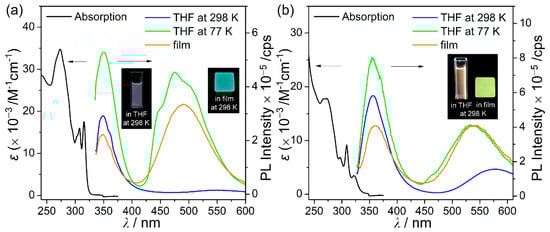 UV-vis absorption and photoluminescence (PL) spectra (λex = 310 nm for C1 and 322 nm for C2) of (a) C1 and (b) C2. Black: absorption spectra in tetrahydrofuran (THF) (30 μM), blue: PL spectra in THF (30 μM) at 298 K, green: PL spectra in THF (30 μM) at 77 K, and orange: PL spectra in films (5 wt% doped with poly(methyl methacrylate) (PMMA)) at 298 K. The insets show the emission color of each state when irradiated with a hand-held UV lamp (λex = 365 nm).