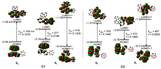 To elucidate the nature of the electronic transitions and to analyze the orbitals in C1 and C2, their S0- and S1-optimized structures were subjected to TD-DFT calculations while using the B3LYP functional (Figure 4 and Table 2); the geometries were optimized from initial structures based on the X-ray crystal structure of C1. To include the effects of the THF solvent [75,76], a conductor-like polarizable continuum model was also used. The computational data for the S0 state show that HOMO → LUMO transitions are the lowest-energy electronic transitions in C1 and C2. The HOMO of each compound is entirely localized on the bifluorene moiety (>99%, Tables S4 and S6), whereas the orbital contribution of the o-carborane unit to each LUMO is slightly higher, at >15%. These results indicate that the lowest-energy absorptions of C1 and C2 are attributable to the π−π* transitions in the bifluorene moieties, with minor contributions from ICT transitions between the o-carborane and fluorene groups. All of the calculated results based on the optimized S0 structures are in good agreement with the experimentally observed UV/Vis absorption spectra.