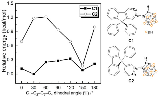 The geometries of C1 and C2 in their ground (S0) and first-excited (S1) states in THF were optimized at the B3LYP/6-31G(d,p) [73] level of theory. Vertical excitation energies at the optimized ground- and first-excited-state geometries were calculated while using the time-dependent density functional theory (TD-DFT) method [74] at the same level of theory. Solvent effects were included while using the conductor-like polarizable continuum model (C-PCM) [75,76]. We constructed one dimensional potential energy surfaces (PESs) as function of dihedral angle (Ψ = C1‒C2‒C3‒C4) by rotating the o-carborane cage, vide infra (Figure 5) in the 0–180° range in 30° steps in order to determine the most stable geometries. Among the 49 initial conformations for each compound, conformations that show unphysical atomic overlaps were excluded from further geometry optimization. The dihedral angle was fixed, while the other geometrical variables were fully relaxed during geometry optimizations and energy calculations of the resultant initial conformations. All geometry optimizations and energy calculations were performed while using the Gaussian 16 program [77]. The frequency-checks for all of the optimized structures were performed and no imaginary frequency was confirmed. The percent contribution of a group in a molecule to each molecular orbital was calculated while using the GaussSum 3.0 program [78]. GaussView 6 was used to visualize molecular properties [79].