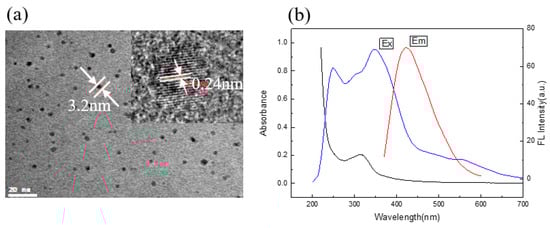 (a) The TEM images of C/N-dots; (b) UV-vis absorption (black line) and excitation (blue line) and emission (red line) spectra of the aqueous dispersion of the C/N-dots.