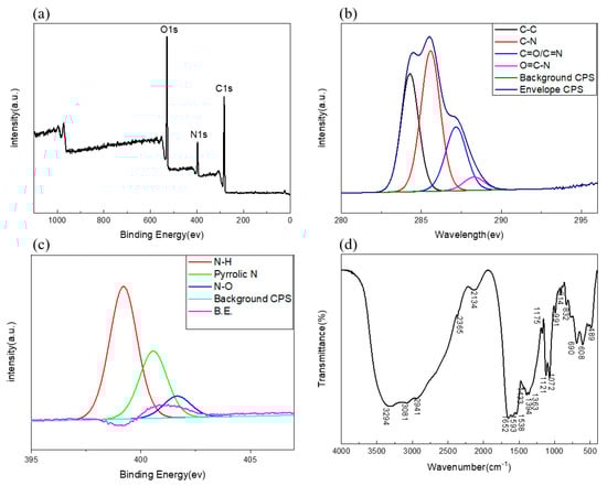 (a) The full-scale XPS spectrum of C/N-dots. High-resolution C1s (b) N1s (c) XPS spectra of C/N-dots. (d) FTIR spectrum of C/N-dots.