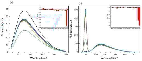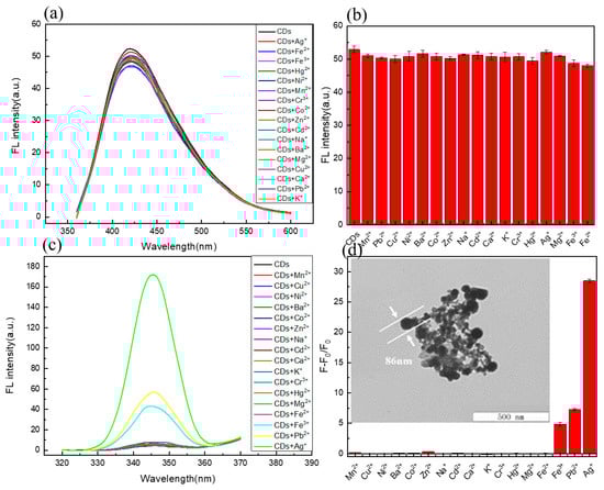 To investigate the selectivity [36,50] of C/N-dots to metal ions, several fluorescence spectra were exhibited. The fluorescence responses of C/N-dots with the addition of various metal ions were explored. The concentration of the metal ions was 33.3 μM, and the changes in the fluorescent intensity of both the emission peak and scattering peak were collected at the same time. As shown in Figure 3a,c, fluorescent (FL) intensity had no obvious sensitivity to metal ions, however, the scattering peak increased sharply with the addition of Ag+, which was related to the unique optical property of Ag+. TEM results showed that the addition of AgNO3 led to the formation of an Ag+ complex in the system with a size of about 86 nm, which was the reason for the strong scattering peak. Although lead and iron ions can cause scattering, this is not obvious. The fluorescence response of other metal ions was shown in Figure 3b, and the corresponding RLS changes were shown in Figure 3d. It was clearly demonstrated that the as-prepared C/N-dots were insensitive to almost 17 metal ions at the range of 345–600 nm, implying that C/N-dots could shield the interference of metal ions. However, when the range of the scattering peak was captured, the response of silver ions was found. Meanwhile, biothiols possessed a strong complexing ability to silver ions, which could be used to detect biothiols.
