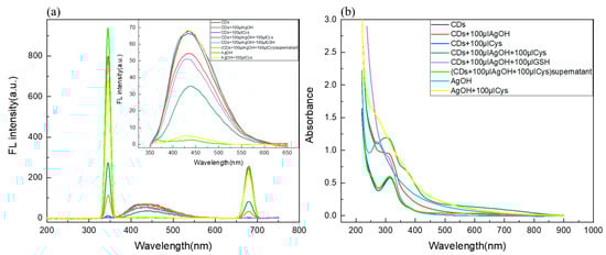 In order to investigate the feasibility of using a C/N-dots–Ag+ complex as a probe to detect Cys and GSH, we studied the corresponding variations in fluorescence and UV-vis spectra. The results are shown in Figure 4. A certain number of C/N-dots were added into phosphate buffer, then 100 μL (0.01 mol/L) AgNO3 was added into the above solution to construct the C/N-dots–Ag+ complex system. Cys and GSH were added into this system. Results showed that fluorescent intensity possessed obvious quenching in the emission peak with Cys addition, while the corresponding UV-vis absorption spectrum increased significantly at 280–350 nm, and its absorption band overlapped with the absorption band of C/N-dots. The Ag+ complex was separated by centrifugation and a supernatant was obtained for fluorescent detection. As shown in Figure 4a, UV-vis and fluorescence absorption spectrum of C/N-dots recovered, indicating that Cys adsorbed onto the surface of Ag+ complex, which led to the enhancement of absorbance at 280–350 nm in the UV-vis absorption spectrum and the fluorescence quenching of the sensor through inner filter effect (IFE). There was no obvious change with the addition of GSH. Therefore, the C/N-dots–Ag+ complex system obtained the ability to distinguish between Cys and GSH, and quantitatively analyze Cys. As shown in Figure 4a, the Ag+ complex could cause the enhancement of RLS in a C/N-dots–Ag+ complex system. Adding equal amounts of Cys and GSH into the system could both lead to a reduction in RLS. However, the decrease with the addition GSH was greater than with Cys, indicating that the system was more sensitive to GSH. Furthermore, the addition of GSH made the solution clear, indicating that GSH played a role in promoting the dissolution of the Ag+ complex, and that was why RLS intensity reduced. However, the addition of Cys could not make the Ag+ complex dissolve and RLS disappeared after centrifuged. This proved that Cys could adsorb onto the surface of the Ag+ complex, and thus modify the surface properties, which led to a reduction in RLS intensity. Its mechanism differed from GSH. In sum, a C/N-dots–Ag+ complex could detect both Cys and GSH by RLS, and its sensitivity was higher than fluorescence methods, but it could not discriminate them. Therefore, the two spectroscopic methods could be combined to make a distinction between Cys and GSH and also improve the sensitivity of detection.