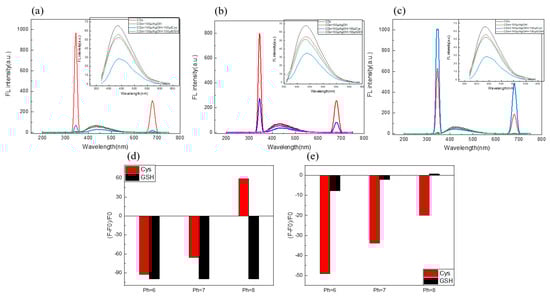 In order to obtain the optimal detection conditions, the effects of pH on the fluorescence intensity of Cys, and GSH on the C/N-dots–Ag+ complex system, were investigated in the subsequent experiment. Firstly, the quenching rate of Cys was studied, as shown in Figure 5: at pH = 6, the quenching rate was −49.07%; at pH = 7 the quenching rate was −33.76%; at pH = 8, the quenching rate was −19.91%; and, as for GSH, quenching rates were −7.7%, −2.12% and −2.79%, respectively. Therefore, we excluded pH = 8. Regarding the scattering peak, the quenching rates for Cys were −92.69%, −65.55% and 59.13%, respectively, and for GSH, they were −99.81%, −99.82% and −99.72%, respectively. No obvious change was found in detecting GSH by scattering peak. Because there was only a slight difference in detecting Cys and GSH at pH = 6, PH = 7 would be the best choice. In addition, considering the application of the probe to the serum sample, the best choice for this experiment was pH = 7.