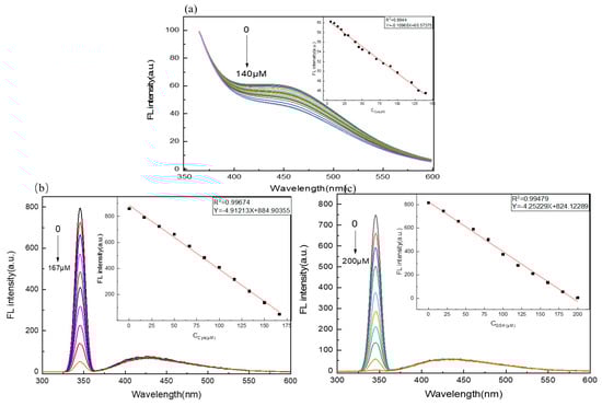 Under the optimized conditions, various concentrations of Cys were added to the C/N-dots–Ag+ complex system. The fluorescence intensity was collected to evaluate the sensitivity and linearity of the C/N-dots–Ag+ complex system sensor for detecting Cys. As displayed in Figure 7a, the fluorescence intensity of the C/N-dots–Ag+ complex system decreased gradually at around 430 nm, along with the increased Cys. With a linear correlation of R2 = 0.9944, the linear relationship was expressed as Y = −0.10968X + 60.57375 in the concentration range 0–140 μM, where Y was the fluorescence intensity of the C/N-dots–Ag+ complex system in the presence of Cys, and X was Cys concentration. The LOD was calculated to be 6.6 μM. Meanwhile, we found that the intensity of the scattering peak linearly varied with the increase in Cys. As shown in Figure 7b, the RLS intensities of the C/N-dots–Ag+ complex system decreased gradually with the increase in Cys. With a wide concentration range, from 0 to 167 μM, the probe exhibited a good linear relationship toward Cys at 345 nm scattering peak, and the equation could be expressed as Y = −4.91213X + 884.90355, where Y represents the RLS intensity of the scattering peak and X represents the concentration of Cys. The LOD was 64 nM. In Figure 7c, FL intensity increased linearly with the raised concentration of GSH, ranging from 0 to 200 μM, with an equation Y = −4.25229X + 824.12289, R2 = 0.99479. The LOD was 74 nM. In sum, with regard to both emission peak and scattering peak, the probe displayed an excellent linear for Cys and GSH detection. The calculation of the LOD uses the equation: LOD = 3σ/s; where σ is the standard deviation of the blank solution and s is the slope of the linear equation. The S/N ratio is 500:1 r.m.s.; however, as is shown in Table 1, compared with other methods in the literature, in our approach, by combining the fluorescent method and RLS technique, the detection sensitivity of RLS is much higher than that of the fluorescence method, achieving a lower detecting limit, as shown in Table 1. More importantly, we can quantitatively detect Cys by the fluorescent method, and detect GSH by the RLS technique, therefore, we can distinguish Cys and GSH in the same system, with the same equipment.