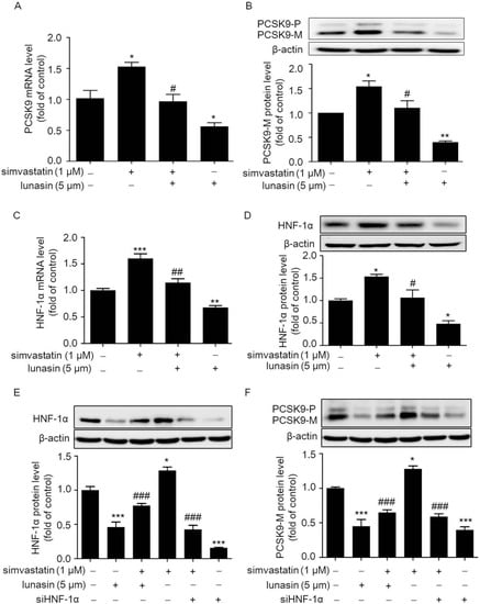 Effects of simvastatin combined with lunasin treatment on PCSK9 and HNF-1α expressions at the mRNA and protein levels in HepG2 cells. HepG2 cells were treated with simvastatin and/or lunasin for 24 h. The mRNA (A) and protein (B) levels of intracellular precursor PCSK9 (PCSK9-P) and mature PCSK9 (PCSK9-M), as well as the mRNA (C) and protein (D) level of HNF-1α were determined by qRT-PCR and Western blot using β-actin as an internal control, respectively. After transient transfection with siRNA for 4 h, EA.hy 926 cells were maintained in fresh medium for 48 h and treated with 1 μM lunasin for an additional 24 h. Then, the levels of HNF-1α (E) and PCSK9 (F) protein expression were analyzed by Western blot analyses, respectively. * p < 0.05, ** p < 0.01, *** p < 0.001 vs. the control group; # p < 0.05, ## p < 0.01, ### p < 0.001 vs. the simvastatin group (n = 3, means ± SEM).