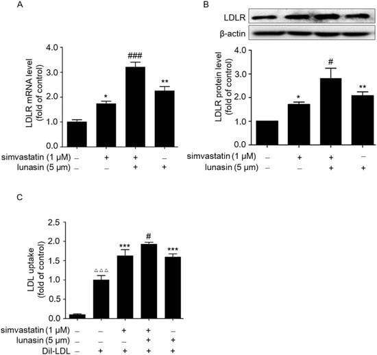 Effects of simvastatin in combination with lunasin treatment on the LDLR and LDL uptake levels in HepG2 cells. HepG2 cells were treated with simvastatin and/or lunasin for 24 h. The mRNA (A) and protein (B) levels of LDLR were analyzed by qRT-PCR and Western blot using β-actin as an internal control, respectively. * p < 0.05, ** p < 0.01 vs. the control group; # p < 0.05, ### p < 0.001 vs. the simvastatin group. (C) LDL uptake was assessed in HepG2 cells after treatment with simvastatin and/or lunasin for 24 h on a fluorescence plate reader. ΔΔΔ p < 0.001 vs. the negativecontrol group; # p < 0.05 vs. the simvastatin group; *** p < 0.001 vs. the 20 μg/mL Dil-LDL group (n = 3, means ± SEM). Dil-DLD: LDL labeled with 1,1′-dioctadecyl-3,3,3′,3′-tetramethylindocarbocyanine perchlorate.