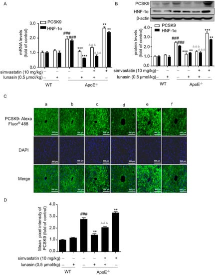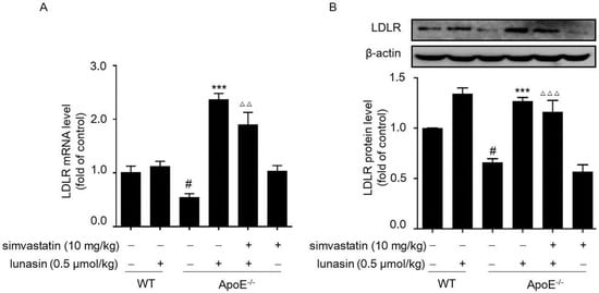 Additionally, it was shown that hepatic LDLR mRNA and protein levels were elevated by administration with either simvastatin or lunasin alone as compared to the model control group (ApoE−/− mice fed with HFD and i.p. administrated with vehicle); however, they were remarkably up-regulated to a greater extent when treated with simvastatin combined with lunasin (Figure 4A,B). The data indicated that simvastatin combined with lunasin could enhance LDLR expression level more effectively than simvastatin monotherapy via suppressing simvastatin induced elevation of the PCSK9 level in ApoE−/− mice fed with HFD.