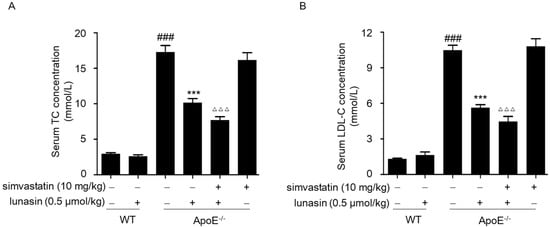 Effects of combined drug on serum cholesterol levels in ApoE−/− mice fed with HFD. ApoE−/− mice were i.p. administrated with 10 mg/kg simvastatin and/or 0.5 μmol/kg lunasin on daily basis for four weeks. LDL-C (A) and TC (B) concentrations in serum samples were measured by biochemical kits. ### p < 0.001 vs. C57BL/6 mice administrated with normal saline (NS); *** p < 0.001 vs. ApoE−/− mice administrated with NS; ΔΔΔ p < 0.001 vs. ApoE−/− mice administrated with simvastatin (n = 8, means ± SEM).
