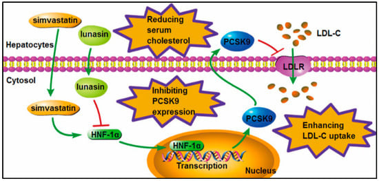 Statins, a class of specific hydroxy-3-methyl-glutaryl-CoA (HMG-CoA) reductase inhibitors, have been advised as the first-choice hypocholesterolemic agents by the American College of Cardiology (ACC)/American Heart Association (AHA) []. In principle, statins can suppress the synthesis of endogenous cholesterol by competitively inhibiting HMG-CoA reductase and accelerate clearance of circulation LDL-C by up-regulating hepatic low density lipoprotein receptor (LDLR) [,,]. However, statins may strongly up-regulate proprotein convertase subtilisin/kexin type 9 (PCSK9) by inducing the expression of hepatocyte nuclear factor 1α (HNF-1α), the dominating transcription factor of PCSK9 to cause the resistance to the LDL-cholesterol lowering effect of statins [,]. The underlying mechanism is that the up-regulated PCSK9 reduces the LDLR level via binding to it and transporting it to the lysosome for degradation [], which eventually attenuates the clinical performance of statins to a large extent. Accordingly, various statin combination therapy approaches have been considered to enhance the LDL-C lowering effect and reduce the dosage of statins, as well as decrease the risk of adverse effects in the clinic [].