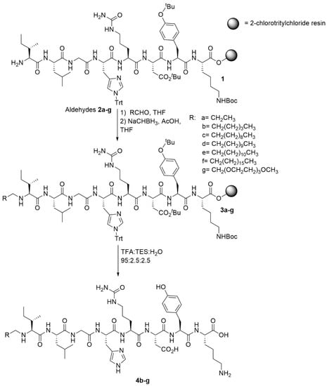 - Al-Obeidi, F.; Hruby, V.; Yaghoubi, N.; Marwan, M.M.; Hadley, M.E. Synthesis and biological activities of fatty acid conjugates of a cyclic lactam alpha-melanotropin. J. Med. Chem. 1992, 35, 118–123. [Google Scholar] [CrossRef] [PubMed]