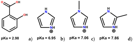 Molecular representation of protonated (a) SA; (b) IMI; (c) 1-MEIM and (d) 2-MEIM with their pKa values.