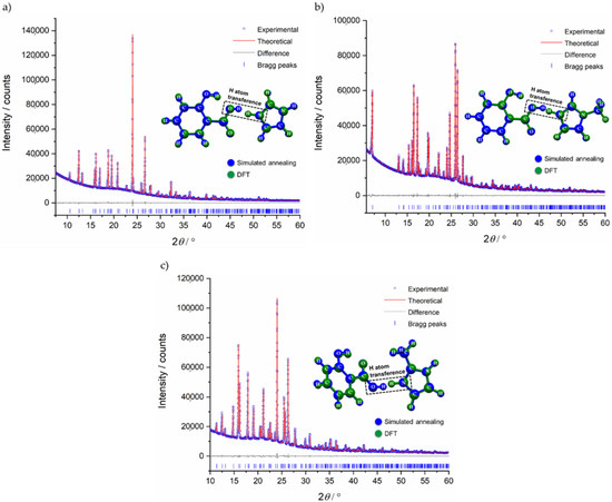 The accurate study of the intermolecular interactions opens the possibility to understand API physicochemical behavior and that of their multicomponent crystal forms [7,8]. For that, structural information is needed and is conventionally obtained from X-ray diffraction. The particular use of powder X-ray diffraction (PXRD) for structure determination of inorganic/organic and pharmaceutical systems has been exploited in several studies [1,9,10,11,12,13,14,15]. This approach revealed to be a powerful tool, especially for systems in which the crystallization into single crystal is limited or difficult.
