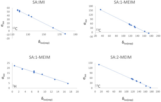 Unambiguous assignment of 13C ssNMR resonances was achieved by plotting the theoretical chemical shielding (σiso) against the experimental CSs (δiso(exp)) (Figure 3). As can be observed, there is a good correlation between both σiso and δiso(exp) variables, indicating that the models solved by PXRD are reliable. In the case of SA:1-MEIM, it was possible to assign the 1H resonances as the signal resolution was good enough. For SA:IMI and SA:2-MEIM (Figures S5 and S9), such assignment was not possible due to the very poor resolution of 1H NMR spectra. All ssNMR spectra are presented in Figures S5–S10.