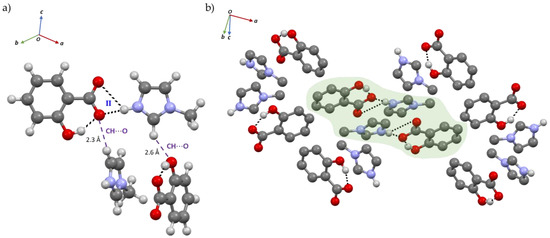 (a) Strong N-H(1-MEIM)O(SA) and weak C-H(1-MEIM)O(SA) HB interactions of SA:1-MEIM salt; (b) Packing interactions (light green) highlighting the two independent parallel layers. SA aliphatic hydrogen atoms were omitted for clarity.