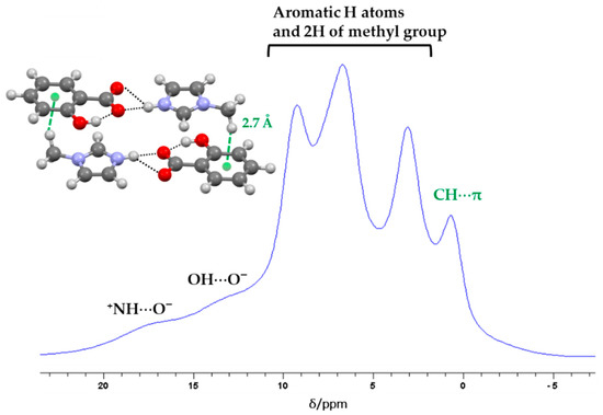 Contrarily to SA:IMI, the co-former used in the preparation of SA:1-MEIM has one of the HB acceptors (nitrogen atom) blocked by a methyl group. The packing structure is now breaking from crossed-chains to small independent layers (Figure 5b), composed by one SA and one 1-MEIM molecules which are interacting through N-H(1-MEIM)O−(SA), dH…O = 1.72(7) Å HB, mode II (Figure 5). The weak C-H(1-MEIM)O(SA), dH…O = 2.3 and 2.6 Å interaction plays a similar rule as described for the previous salt, helping the packing growing in all directions and allowing the interconnection between the layers. The stability of this interconnection occurs due to the additional C-H(1-MEIM)π (SA), dH…π = 2.7 Å HB. This interaction can be easily detected by 1H ssNMR, as the δiso(exp) of one of the methyl group hydrogen atoms is shifted towards higher field in comparison with the other two (Figure 6 and Table S2). The direct effect of imidazole ring current gives electron density to the hydrogen atom, directly pointed to the middle of the ring, resulting in a shielded effect. The hydrogen atoms involved in the N-H(1-MEIM)O−(SA) and O-H(1-MEIM)O−(SA) HBs appear, as expected, at lower field due to the deshielded effect of the oxygen atom that participates in the HB interaction.