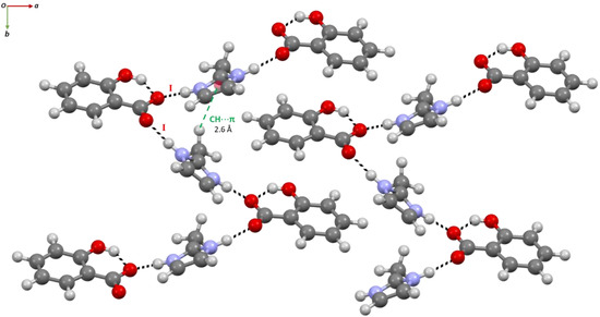 Zig-zag packing arrangement of alternated SA/2-MEIM molecules, along b, evidencing the +N-H(2-MEIM)O−(SA) and C-H(2-MEIM)π(2-MEIM) HB interactions.