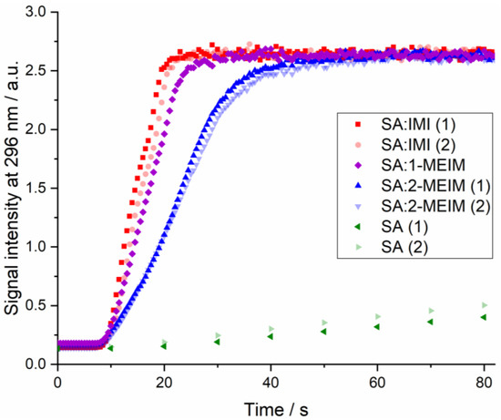 Dissolution rate plot of SA, SA:IMI, SA:1-MEIM and SA:2-MEIM, in both first (1) and second(2) assays, with intensity values of signal at 296 nm (SA absorption band) over relative time (addition of materials at 0 s).