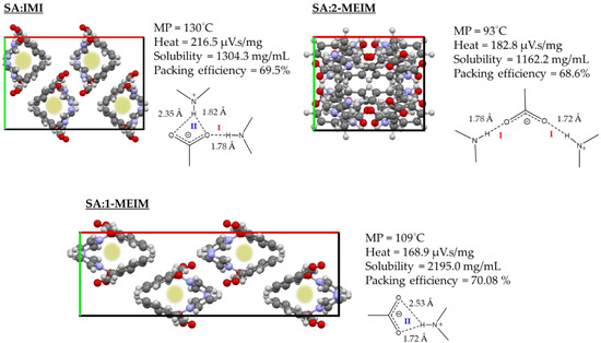 Overall packing view along c for SA:IMI, SA:1-MEIM and SA:2-MEIM alongside with details about melting point temperature (MP), heat, solubility, packing efficiency and HB interactions.