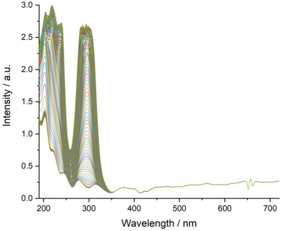 UV/VIS spectra of SA:2-MEIM dissolution study stacked over time, showing the building-up of signals in the range of 200–300 nm. A total of 252 spectra were acquired with a sampling rate of 500 ms.