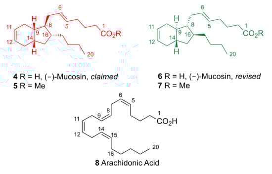 Claimed and revised structures of (−)-mucosin and relationship to arachidonic acid.