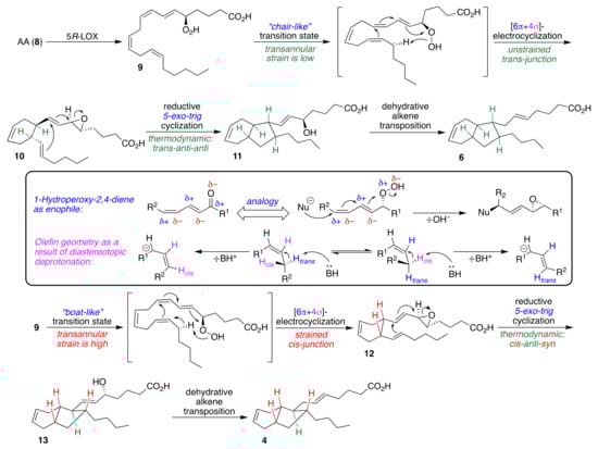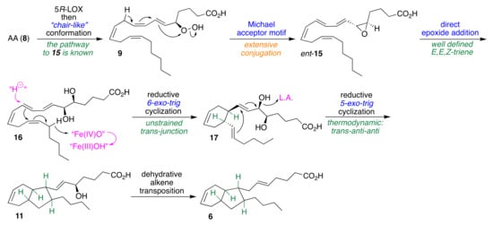 If accepting AA (8) as the progenitor of (−)-mucosin (6), the inductor of asymmetry might be searched out amongst the enzymes active on the PUFA-backbone. More explicitly, arachidonate 5-lipoxygenase (5-LOX) stereoselectively converts AA (8) to the corresponding 5-hydroperoxide 9 in both terrestrial and marine organisms [,]. Furthermore, two antipodal isoforms, 5S- and 5R-LOX, have been identified [,]. Thus, assuming that the biosynthetic pathway leading to (−)-mucosin (6) is initiated by conversion of AA (8) to the 5R-hydroperoxide 9 by 5R-LOX, several ensuing scenarios can be envisioned.