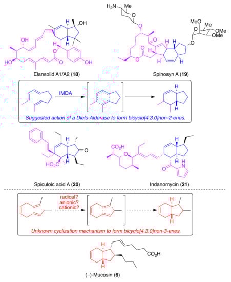 A polyketide pathway cannot be dismissed to have superseded AA (8) in the biosynthesis of (−)-mucosin (6). In this sense, the fatty acid synthase (FAS) becomes synonymous with a polyketide synthase (PKS) set to shape the fused carbocycle through the modular machinery of malonyl CoA []. There are, in fact, a number of marine natural products with a hydrindane motif that have been ascribed to a polyketide origin. Of particular significance are spinosyn A (18), elansolid A1/A2 (19), spiculoic acid A (20) and indanomycin (21), which have a trans-fused bicyclo[4.3.0]non-2-ene core as their common feature (Scheme 4) [,,,]. At the moment, these compounds are at the epicentre of an ongoing debate revolving around whether or not Diels-Alderases are a part of Nature’s enzymatic machinery []. As a retron, the fusion geometry and the position of the double bond within the bicyclo[4.3.0]non-2-ene architecture are the tell-tale signs of an intramolecular Diels-Alder reaction (IMDA) [].