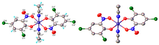 The molecular structure of copper bis(2,4-dichloro-6-nitrophenolato) di(acetonitrile) (2k), shown both with (left) the hydrogen atoms simulated using riding models and without (right). Symmetry transformations: (i) 1–x, –y, 1–z; (ii) x, –y, 1–z. Bond distances (Å): Cu-O(1) 1.91(1), Cu-O(2) 2.16(1), Cu-N(1) 2.199(6). The alternative positions of nitrosophenol ligands, generated by a 2-fold axis (transformation ii) are omitted for clarity (Figure S3). Thermal ellipsoids are drawn at the 50% probability level.