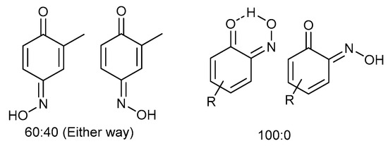 Even for the stable nitrosophenol compounds, the isolated yields were often relatively low. It might be that only one of the two organic ligands can be successfully displaced by the polymer-supported thiourea for some complexes, giving a maximum yield of 50%. For the ortho-benzoquinone-monoxime structures, only one set of resonances is observed by NMR spectroscopy despite the possibility of E/Z isomerism about the C=N double bond. This is because the formation of an intramolecular H-bond ensures that only one diastereomer is found (Figure 3). This was not the case for the para-benzoquinone-monoximes such as 2-methyl-1, 4-benzoquione-monoxime (3l), for which both stereoisomers were observed; there was even a third structure observed for 2-chloro-1, 4-benzoquinone-monoxime (3m), believed to be the nitrosophenol tautomer albeit in small quantities. The reason that no second (nitrosophenol) tautomer is observed for the ortho-ligands could be that the H atom is in the same place whichever tautomer and hence the structures are related by resonance (Figure 4).