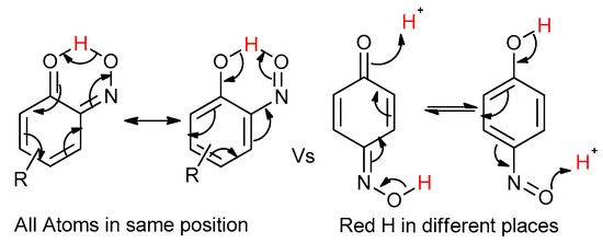 The consideration that the quinone and nitroso structures may be related by resonance if the nitroso is ortho to the phenol. Otherwise, a hydrogen atom is in a different position depending on the tautomer.
