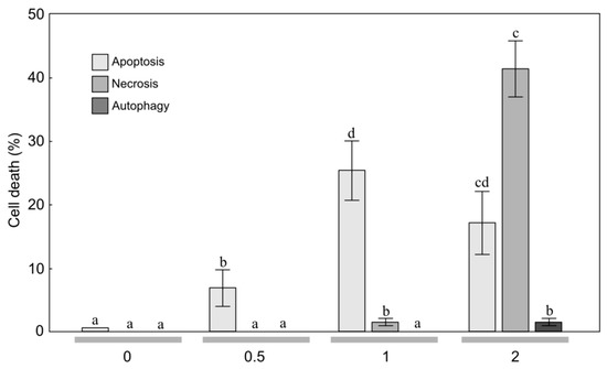 Level of apoptosis, necrosis, and autophagy induction in anaplastic astrocytoma MOGGCCM cells treated with the essential oil (concentration: 0, 0.5, 1, 2 μL/mL) from mountain arnica achenes collected from 3-year-old plants. The values designated by the different letters are significantly different (p = 0.05). (Tukey test, p < 0.05).