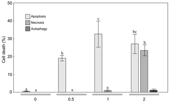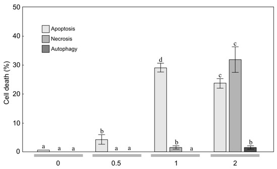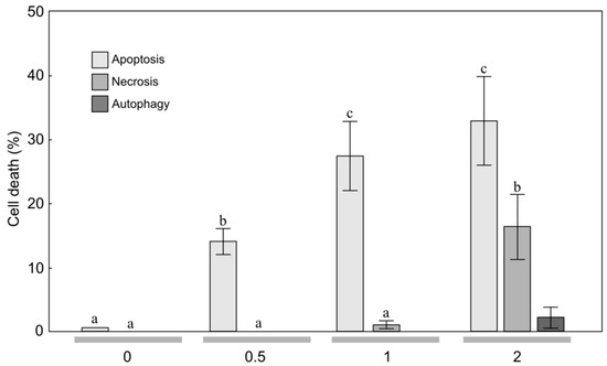 Level of apoptosis, necrosis, and autophagy induction in glioblastoma multiforme T98G cells treated with the essential oil (concentration: 0, 0.5, 1, 2 μL/mL) from mountain arnica achenes collected from 4-year-old plants. The values designated by the different letters are significantly different (p = 0.05). (Tukey test, p < 0.05).