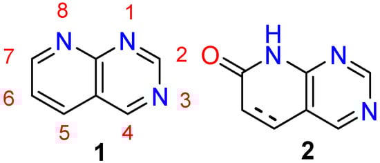 Pyridopyrimidines are ortho-fused bicyclic heterocyclic structures formed by the fusion of a pyridine and a pyrimidine ring. There are four possible isomeric pyridopyrimidines [,] and one of them is pyrido[2,3-d]pyrimidines (1,3,8-triazanaphtalenes) 1 shown in Figure 1. Such structure is included in the concept of privileged heterocyclic scaffolds, introduced by Evans in the late 80s [] and recently revised by Altomare [], for drug discovery probably due to their resemblance with DNA bases. Some examples of drugs based on such structure that have reached the market are piritrexim isethionate (treatment of bladder cancer and urethral cancer) and pipemidic acid (antibiotic active against Gram-negative and some Gram-positive bacteria) [].