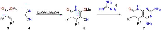 Among these bicyclic heterocyclic compounds, our group has been especially interested in the pyrido[2,3-d]pyrimidin-7(8H)-ones (2) (Figure 1) since the initial synthetic approach of Victory et al. to 2,4-diamino-5,6-dihydropyrido[2,3-d]pyrimidin-7(8H)-ones (7) obtained by reaction of 2-methoxy-6-oxo-1,4,5,6-tetrahydropyridine-3-carbonitriles (5), prepared upon treatment of an α,β-unsaturated ester (3) with malononitrile (4) in the presence of NaOMe/MeOH, and guanidine (6) (Figure 2) []. Since then, our group has developed synthetic methodologies allowing to access systems 2 with up to five diversity centers (C2, C4, C5, C6, and N8) and two degrees of unsaturation C5-C6 (note: during the rest of the review substituents at positions C2, C4, C5, C6, and N8 will be depicted as G2, G4, R5, R6 and R8 for a better comparison of the structures).