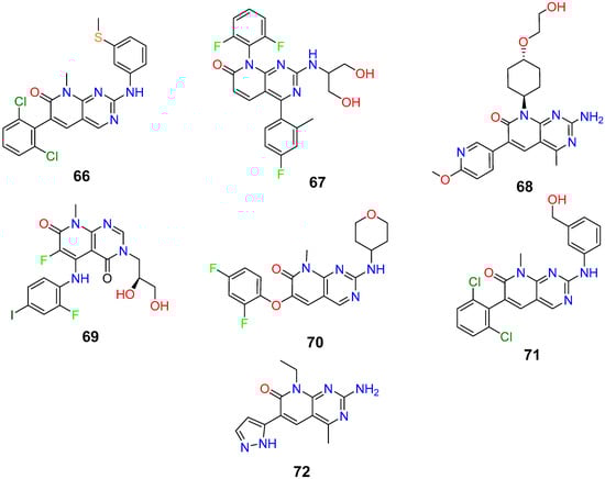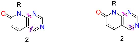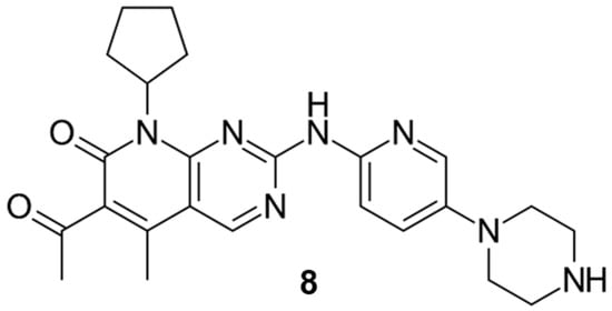 However, if the total number of references is filtered to select the Reviews, the number is reduced to around 180. An inspection of such references indicates that most of them are reviews on the biological activity of pyrido[2,3-d]pyrimidin-7(8H)-ones (2) (mainly as kinase inhibitors [,], anti-leukemic [], against breast cancer [], antihypertensives [], etc.) or about the compound palbociclib (8) approved for the treatment of breast cancer (Figure 3) [].