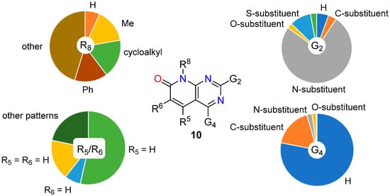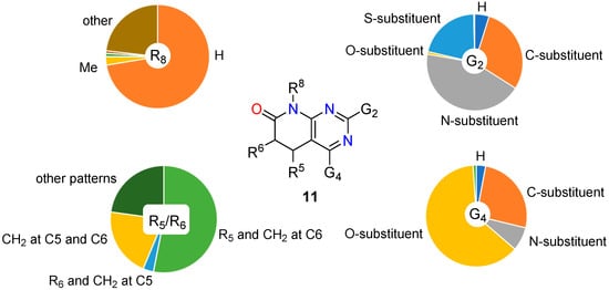 Concerning 5,6-dihydropyrido[2,3-d]pyrimidin-7(8H)-ones (11) (Table 1), the inspection of the percentages reveals that the nitrogen-based substituents at position C2 are the majority (more than 43%) followed by the carbon substituents (around 30%) and sulfur substituents (21%). On the other hand, the oxygen substituents, particularly as a carbonyl group, prevailed at position C4 (around 63%) followed also by the carbon substituents (almost 26%). It is interesting to note that the added percentages at position C2 cover 99.63% of the diversity at such position while in the case of C4 reach 98.99%. We also carried out a search corresponding to the combination of nitrogen substituent at C2 and oxygen substituent at C4 which covers the 37.97% of the total diversity, but includes only around 30 references. Such percentage is high enough taking into account that it corresponds to one of the 20 combinations (5 × 4) possible and can be interpreted on the basis of the similarity of the resulting structures with guanine. In the case of the double nitrogen substitution at C2 and C4, the total number of structures covers 4.30% of the total diversity, the corresponding references coming from our group of research.