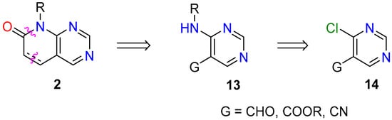 (b) In the second one, a preformed N-substituted pyrimidine-4-amine (13) is used as starting material, which bears a carbon functional group G (CHO, COOR, or CN) at position C5 of the pyrimidine ring. Such precursor is usually formed from the corresponding 4-chloro substituted pyrimidine 14 by nucleophilic substitution with the desired amine. This synthetic approach corresponds to the disconnection of the C5-C6 and C7-N8 bonds of the pyridopyrimidine system (Figure 9). In the case of the CHO group, there are 7248 reactions included in 93 references, 3174 reactions (78 references) for the COOR group, and 115 reactions (seven references) for the CN group. Once more, most of the references are patents. In this synthetic approach, yields are higher than 60% in 840 cases of the 1476 reactions fully described (56.91%).