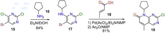 A nice example of the first synthetic strategy is the synthesis of 19, an intermediate in the synthesis of palbociclib [], starting from 5-bromo-2,4-dichloropyrimidine (15) which is substituted by cyclopentyl amine (16) to afford 17 which undergoes a palladium-catalyzed coupling with crotonic acid (18) followed by an intramolecular cyclization to yield the pyridopyrimidine system 19 (Figure 10).
