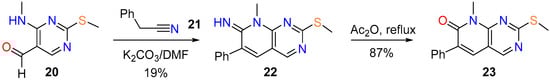 Concerning the second synthetic strategy, an example of the use of a pyrimidine aldehyde for the construction of the pyridone ring is the synthesis of compound 23 [], an intermediate for the synthesis of a series of tyrosine kinase inhibitors, starting from the aldehyde 20 which is condensed with the appropriate nitrile 21 to give the 7-iminopyridopyrimidine 22 that is subsequently transformed in the corresponding pyrido[2,3-d]pyrimidin-7(8H)-one (23) (Figure 11). The oxidation of the 2-methylthio substituent to a sulfone allows the introduction of arylamino substituents in such a position. In some cases, a carboxylic ester is used as a precursor of the aldehyde [].