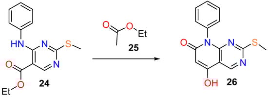 An example of the direct use of a pyrimidine ester is the formation of the 5-hydroxy substituted compound 26 starting from the ester 24 upon condensation with ethyl acetate (25) in a multistep protocol for which the yield is not described (Figure 12) [].