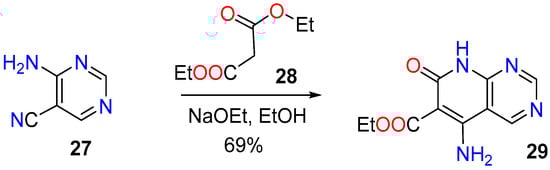 Finally, an example of the use of a pyrimidine nitrile as a precursor is the synthesis of the 5-amino substituted compound 29 by condensation of the nitrile substituted pyrimidine 27 with diethyl malonate (28) in the presence of Na/EtOH (Figure 13) [].